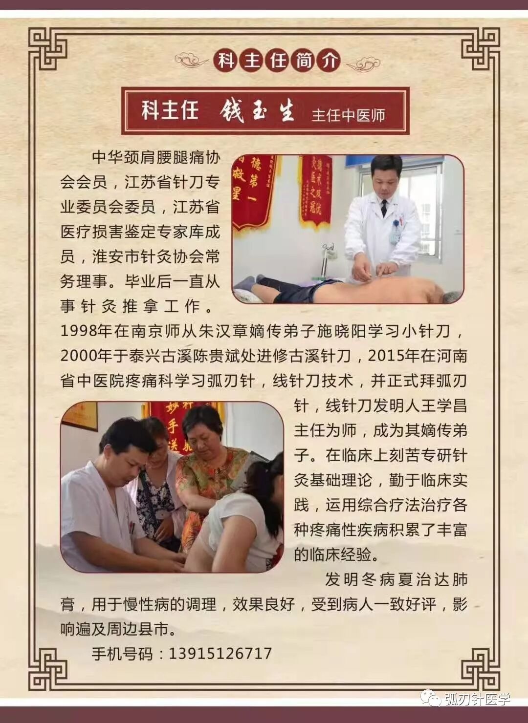 导语在颈肩腰腿痛的临床治疗中,每个人都会有困惑、有疑问,也会有心得、有感悟,欢迎你与我们分享。 江苏淮安涟水县中医院针灸科 钱玉生 我从事疼痛工作二十多年,临床接触到大量的颈肩腰腿痛病人,以前我都是运用住院的方法:针灸、中医正骨、穴位注射、神经根阻滞、小针刀松解,药物内服加外用等方法治疗,临床也帮助好多病人解决了疼痛。 一个偶然的机会,我接触了颈肩腰腿痛网,了解了一些关于弧刃针、线针刀的知识,感觉到这种疗法比较特别,特别是防止再度黏连,不用激素、不用麻药,把我深深吸引住了。2016年1月份,我下了很大的决心,放下班上繁忙的工作,怀着梦想,怀着一颗期待的心来到河南郑州学习弧刃针技术,想亲耳听听王学昌老师系统讲述弧刃针理论、线针刀理论。 那几天的学习,我真切的感受到了弧刃针与中医理论完美的结合,不死板、灵活运用,对每个病人都运用个体化的治疗。特别是“四定原则”:定位、定点、定性、定法,什么都是活的,没有一病一法,一兵一定点,关于灶点的选择,非常灵活,不死板,既有局部选择,又要系统考虑,灶点选准,则疼痛自然会应手而愈。总结这些年的临床经验,特别是那些临床效果不好的病例,我发现绝大部分都是自己的灶点选择出了问题。 可以说通过学习弧刃针技术,我的治疗思路大开,在临床上也更加得心应手了,有机会的话,我准备把弧刃针疗法与传统疗法做一个比较,写成文章,让大家分享,也准备拿做一个观察,弧刃针与针刀疗法的对比,最后谢谢王老师! 我叫杜学存,来自河南社旗,手机号13193681309。我是第十一期的学员,治疗颈肩腰腿痛这些年来,我深深地体会到王学昌老师提出的“五个治疗原则”在颈肩腰腿痛的诊疗过程中的重要性,如果没有详细的问诊和仔细的体格检查,那么就没有准确的定位、精确的定点,正确的定性,也就不可能“定法”,选择对患者最适合的治疗方法,这些核心机制如果掌握不好,那么我们对疗效就不可能有很好的把握。有人说,医生水平高低,很大程度上拼的就是基本功,我认为,这句话一点儿都没错! 在我参加弧刃针学习班的日子里,感谢王老师对我在临床操作出现的问题进行纠正,让我技术日益成熟,操作达到标准化的要求,王老师的帮助,一次次给我补充了正能量! 每一次回到弧刃针学习班复训,我都能体会到:多回来学一次,就有一次想不到的收获。常回家看看,使我的诊疗水平有一次得到了很大的提升。虽然说大恩不言谢,但是我还是想要说,王老师辛苦了,谢谢您!