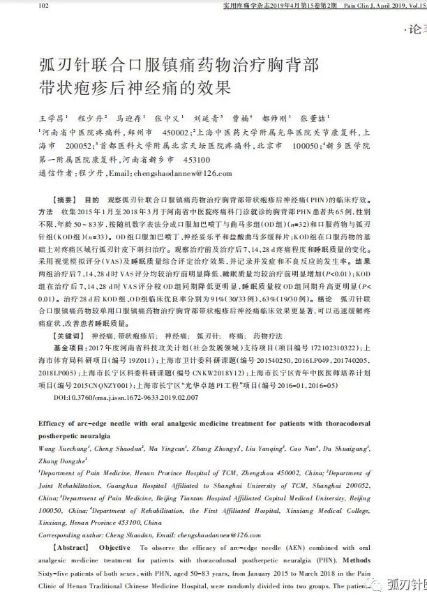 导语 摘自2019.04月《实用疼痛学杂志》。 带状疱疹后神经痛(post-herpetic neuralgia, PHN)是带状疱疹后常见神经病理性疼痛性疾病,因疼痛剧烈、迁延难愈,极大地影响患者的身心健康和生活质量。PHN发病率随年龄增长而增加,呈显著正相关,其中胸背部带状疱疹遗留后遗神经痛的发病率可高达50%[1]。加巴喷丁、普瑞巴林等是治疗PHN的一线用药;背根神经节射频、椎管内阻滞、脊髓电刺激等治疗是疼痛科的常规微创治疗,但需要相关的器械支持和专门的技术培训,基层医院开展存在一定的难度[2],并且疗效差异较大,花费相对高昂。王学昌等[3-6]报道应用弧刃针疗法治疗股外侧皮神经卡压综合征、假性三叉神经痛、重症肩周炎和踝管综合征具有很好的疗效,此法操作简便、创伤小、疼痛轻微、适应证广、经济等优点,已经广泛应用在疼痛治疗,且易于被患者所接受。本研究对胸背部PHN患者采用弧刃针联合口服药物治疗与单用口服药物疗法进行比较,现报告如下。 对象与方法 一、一般资料 1. 病例选择 本研究符合《赫尔辛基宣言》,并与患者及家属签署知情同意书。选择2015年1月至2018年3月河南省中医院疼痛科门诊就诊的PHN患者共 65例,按随机数字表法分成口服加巴喷丁与曲马多组(OD组)(n=32)和口服药物与弧刃针组(KOD组)(n=33)。其中口服药物组中途退出2例(1例因疼痛剧烈难忍要求立即选择微创手术治疗,1例因急性脑梗死放弃治疗),实际纳入研究63例。 2. 纳入标准 (1) 确诊为胸背部疱疹后神经痛患者,发生区有针刺样、烧灼样、刀割样疼痛;(2) VAS≥4;(3) 有痛觉过敏(hyperalgesia)或超敏(allodynia)用棉签,用棉絮端在疱疹区域轻轻划一划表现为剧烈疼痛,即:非疼痛刺激诱发出疼痛,称为痛觉超敏;用棉签尖锐端在疱疹区域轻轻划一划表现为剧烈疼痛,即:轻微疼痛刺激诱发出剧烈疼痛,称为痛觉过敏;(4) 年龄在50~83岁;(5) 病程为皮疹愈合后≥1个月。 3. 排除标准 (1) 因肿瘤免疫力低下而局部并存带状疱疹神经痛者;(2) 凝血功能严重障碍;(3) 合并严重心脑血管等疾病的急性期;(4) 精神状态不稳定者;(5) 认知功能明显减退者。 4. 使用器械 弧刃针(arc-edge needle-scalpel, AEN, 发明专利号201210447675.1、201220590799.0、201220656807.7、201620453237.X),注册商标为“痛王”,又名弧刃针刀(arc-edge eedle-scalpel,AENS),弧刃针灸针(arc-edge acupunctureneedle,AEAN)、微型弧刃手术刀(简称“微刀”)(microarc-edgescalpel,MAES), 由王学昌医师发明,属针刀范畴,其常用型号形如注射器针头,针体中空,远端为弧形刀刃(见图1、2)。 图1 弧刃针结构 注:①刃口②弧刃③斜面④刀口线⑤内壁⑥外壁⑦空心⑧V形⑨刀头长度⑩空心⑪结合部⑫底座⑬针栓底面 图2 不同型号的弧刃针(从左到右0.7×50mm,0.8×50mm,0.7×38mm) 二、治疗方法 1. OD组 接受常规药物治疗,加巴喷丁胶囊(Gabapentin Capsules)按照固定程序由0.3 g 1次/d渐增至0.6 g 3次/d;神经妥乐平片(Neurotropin Tablet),每日2次,每2片;盐酸曲马多缓释片(Tramadol Hydrochloride Sustained-release Tablets)50 mg,每12小时1次,此方案用药至少1月。 2. KOD组 在常规上述口服药物治疗基础上,对疼痛区域的皮肤给予弧刃针皮下刺扫术治疗。术前,若皮损痕迹不明显,可用标记笔将疼痛区域标记“画圈”,划定皮下刺扫范围。具体治疗操作如下: (1) 常规消毒、铺巾。 (2) 进针 根据疼痛区域的范围大小,自外缘进针,进针时针体与皮肤垂直,力度适中,透皮速度要快,不要刺入太深,略过真皮层,在浅筋膜的浅层即可。直径100mm以内,采用0.7x50mm弧刃针,一个进针点即可,100mm以上需要多个进针点,以保证皮损区皆可治疗。 (3) 刺扫 调整针体使之与皮肤呈15°~35°角左右,斜面向上,使针体尽量平行皮肤,沿皮下向前缓缓推进,直至针体尾端;然后再退针至起始处,更改方向,同法刺入,直至将针体长度为直径的扇形或圆形范围内的皮下组织全部刺扫完毕;如果区域较大,则可以多支弧刃针先后皮下无盲区刺扫。