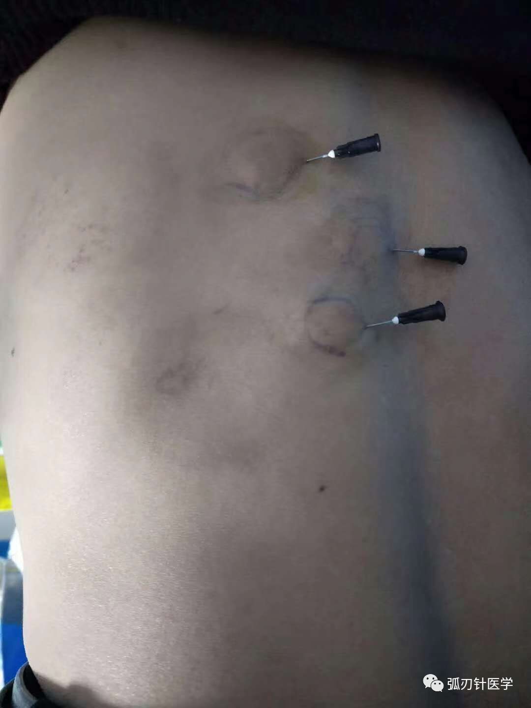 弧刃针皮下刺扫 示意图 疼痛区域直径在4 cm内的患者,可选择0.7mm×38 mm弧刃针,疼痛区域直径大于4 cm的患者可选择0.7×50 mm弧刃针;行针期间可见皮肤呈线状隆起为佳,否则可能为进针较深;在行针过程中,可能时有阻力感,此时稍加用力,会先后有突破感、落空感、“咔”声响、虚无感;在最后拔针前常规抽吸,对可能产生的皮下淤血予以引流;当然,根据皮损面积大小,拔针前也可辅助皮下注射20ug/ml臭氧3-20ml,以消除炎症、增加局部血氧饱和度。(此次研究中未注射臭氧) (4) 扫散 对于严重的或顽固性的疼痛,还可以在刺扫的同时,或刺扫后行“皮下扫散”治疗,即以进针点为支点,手握针栓/针柄,左右摇摆,使针体作扇形运动;扫散完毕,出针。 (5) 保护 在进针点处,可用一个干棉球盖住针孔,再用输液贴或膏药等常规保护,以防感染。 (6) 常规局部按压,减少渗出。 每周治疗 1~